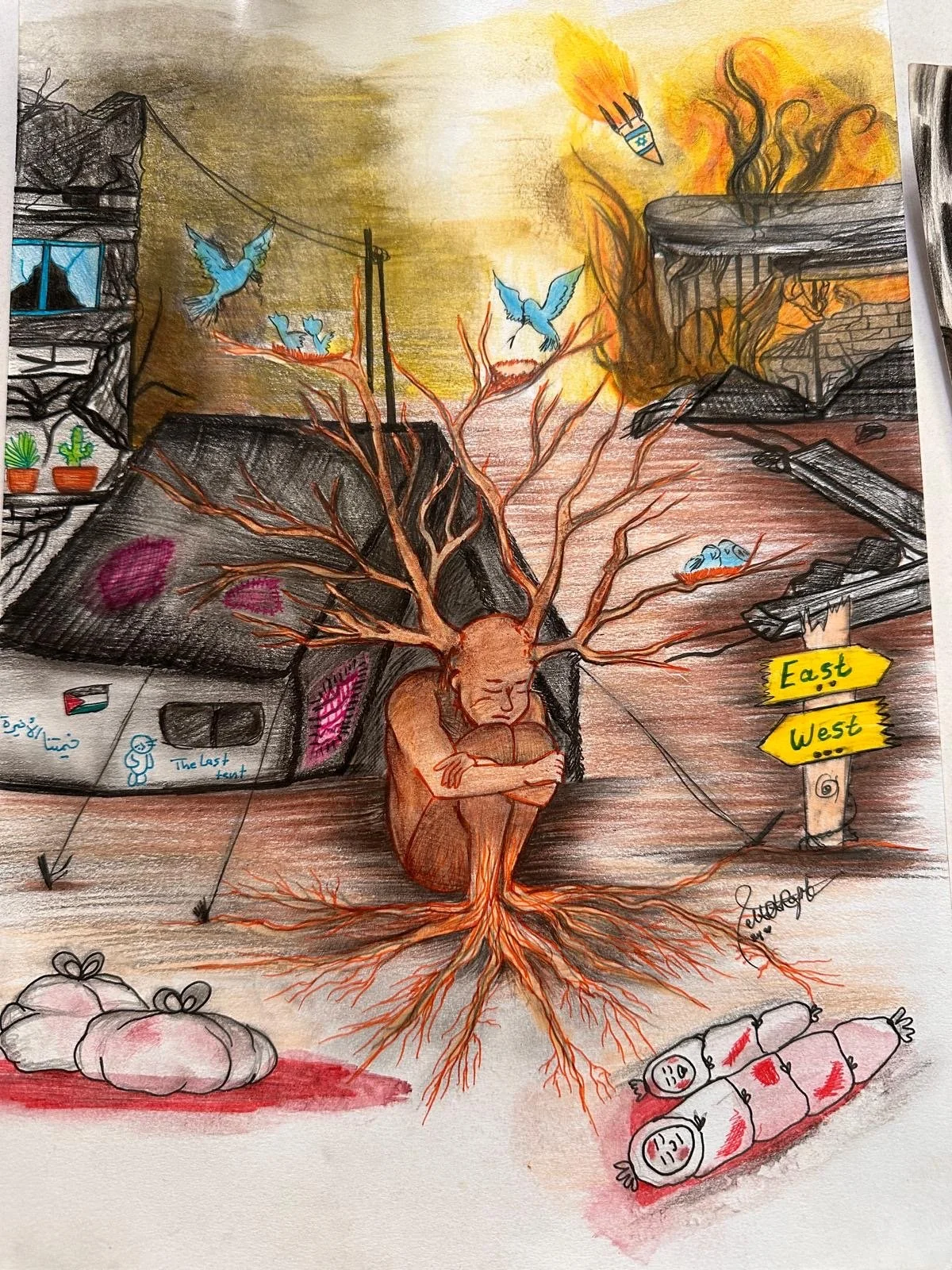 ‘i wait for scraps of hope to live in peace’ Nada Rajab, Artist and Co-ordinator of Art in the Rubble, Hands Up project in Gaza. Instagram - @nada_rajab8431